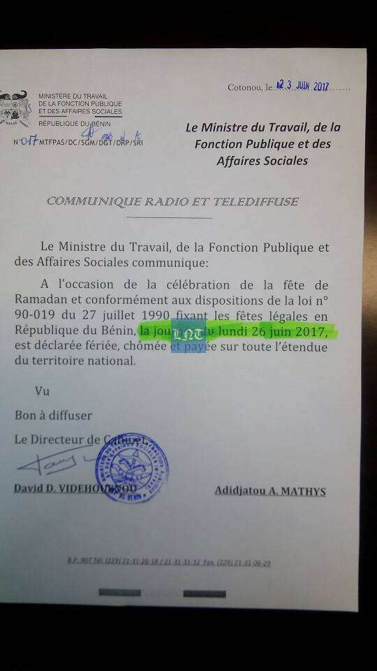 Comme annoncé hier par l’Union Islamique du Bénin par la correspondance N/Ref 2017/030/UIB/SG/SGA/SRE/SA en date du 20 juin 2017, le Ministère du travail a confirmé la date de la fête du Ramadan pour le compte de l’année 2017.Ainsi le lundi 26 juin 20147 est déclaré férié, chômé et payé sur toute l’étendue du territoire Nationale conformément aux dispositions de la loi qui régit les fêtes légales en république du Bénin. Lire le courrier.