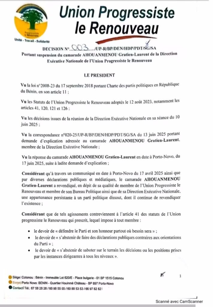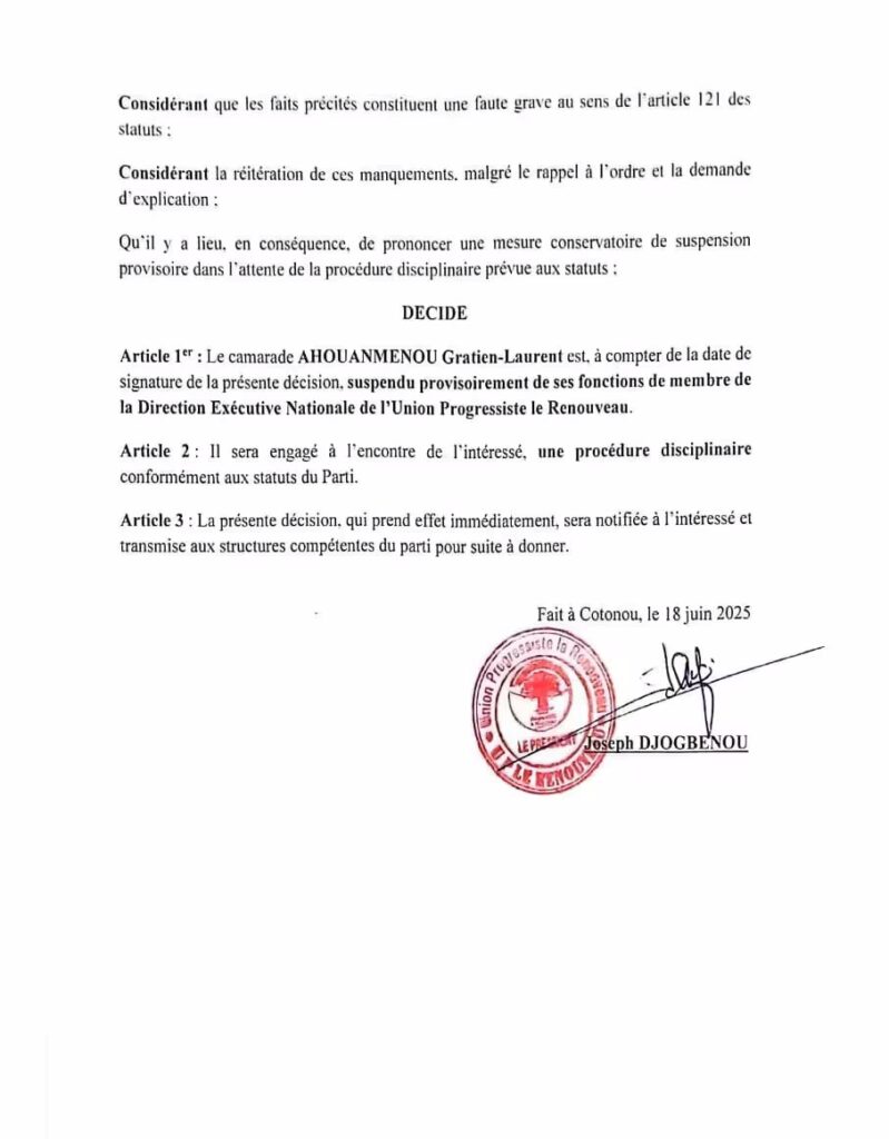 Les documents officiels signés ce 18 juin 2025 détaillent les griefs retenus contre lui et annoncent l’ouverture d’une procédure disciplinaire. Lire ci-dessous l’intégralité de la décision signée par le Président du Parti Union Progressiste Le Renouveau, Joseph Djogbénou. 🔥 « Restez branché à l’actu béninoise sur notre chaîne WhatsApp officielle ! » en cliquant sur ce lien https://whatsapp.com/channel/0029VaCgIOFL2ATyQ6GSS91x