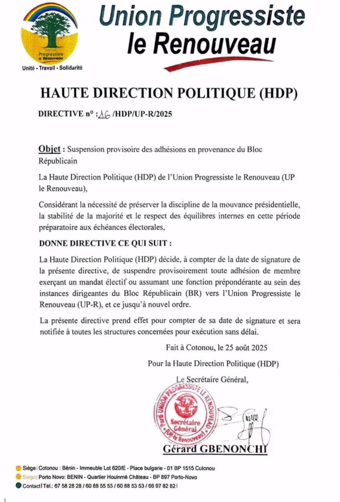 La directive n°46/HDP/UP-R/2025, signée par le Secrétaire Général Gérard Gbenonchi, stipule que « toute adhésion de membre exerçant un mandat électif ou assumant une fonction prépondérante au sein des instances dirigeantes du Bloc Républicain (BR) vers l’Union Progressiste le Renouveau (UP-R) » est suspendue jusqu’à nouvel ordre.